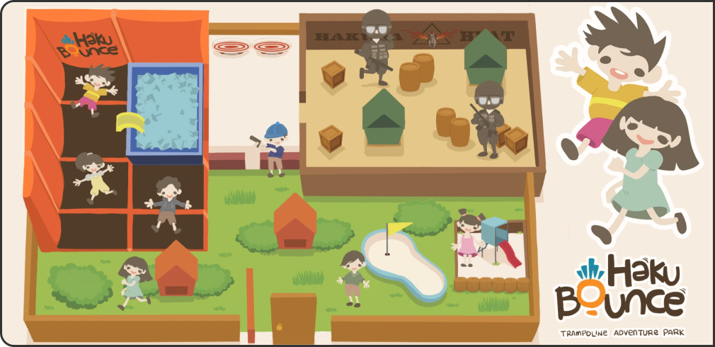 白馬は日本でも有数の観光地として国内外から多くの旅行客が訪れており、特に上質な雪を存分に満喫できるスキー場や、スキー・スノーボードとセットで楽しめる温泉も有名です。豊かな自然の中で様々なアクティビティーを楽しめるエリアの一角にオープンしているアミューズメント施設・HakuBounceでは、雨や雪の日をはじめ冬以外のシーズンでも変わらずに楽しめるトランポリンパークを用意しております。JR大糸線の神城駅からすぐの国道148号線沿いにあるため、自家用車やレンタカーはもちろんのこと、公共の交通機関を利用してお気軽にお立ち寄りいただけます。