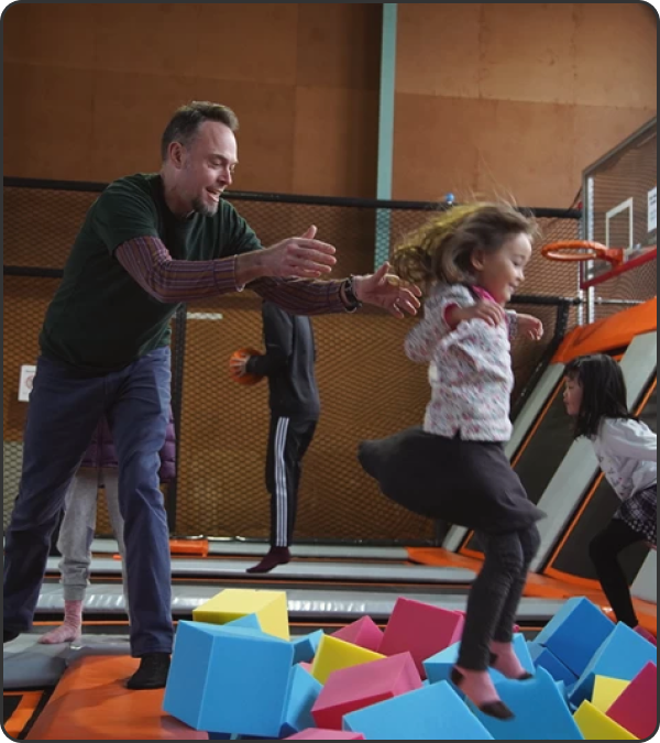 宇宙飛行士やプロアスリートのトレーニングとしても導入されているトランポリンには、体幹や空中でのバランス感覚を強化する作用があり、「日頃の運動不足解消やストレス発散に向いている」と評判です。本格的で多種多様なトランポリンを備えた複合施設でありながら、小さなお子様をお持ちの方でも安心して楽しめることをコンセプトとして営業していますので、ご家族皆様でぜひ一度お越しください。