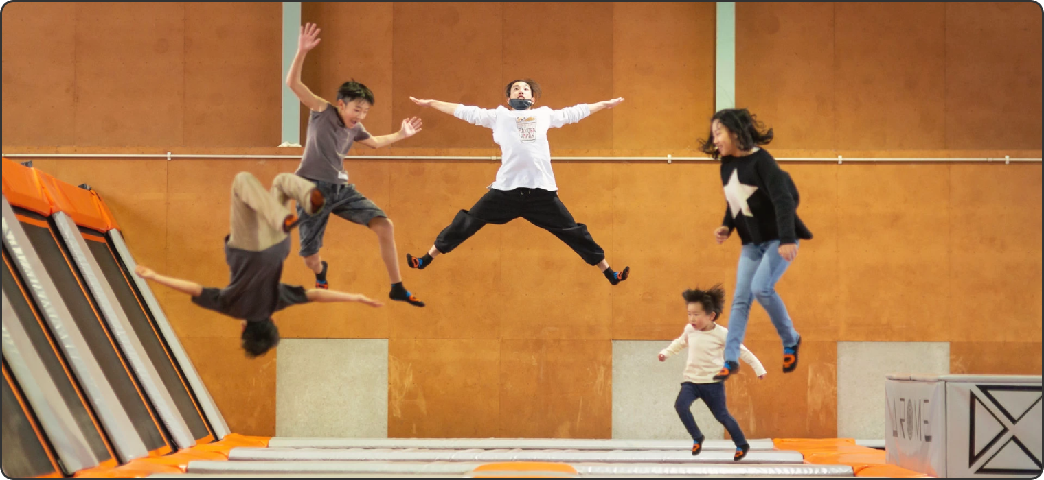 年齢や経験問わず、大人気のトランポリンパークで家族やお友達と跳んで、遊んで、回ってみよう!
