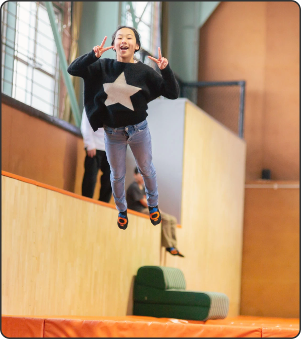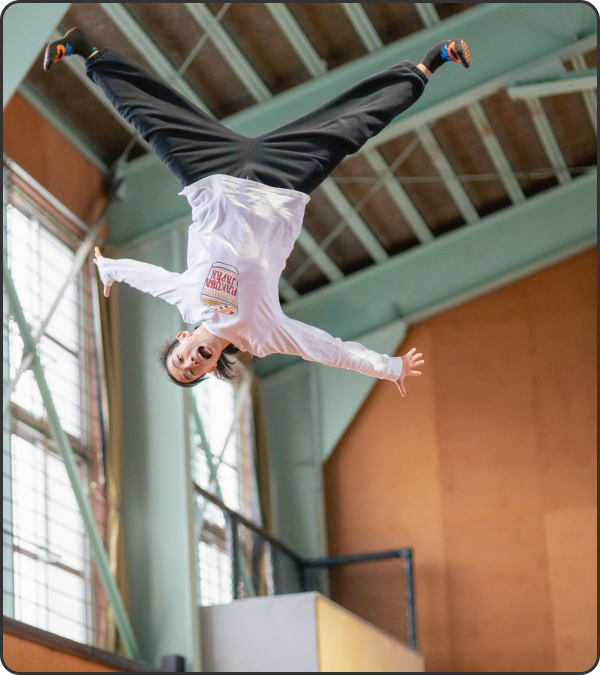 ハクバウンスでは、開放感のあふれる広い施設内にトランポリン、ボルダリング、パルクールエリア等のアクティビティを用意しております。